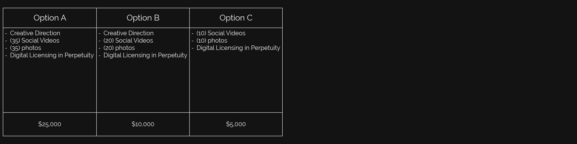 What’s the difference between the options offered, and what makes each unique? The difference between Option A and B lies in the quantity of deliverables. Option C is unique because we don’t provide creative direction. It’s ideal for brands that simply want to join the shoot, go with the flow, and still receive content from the experience.